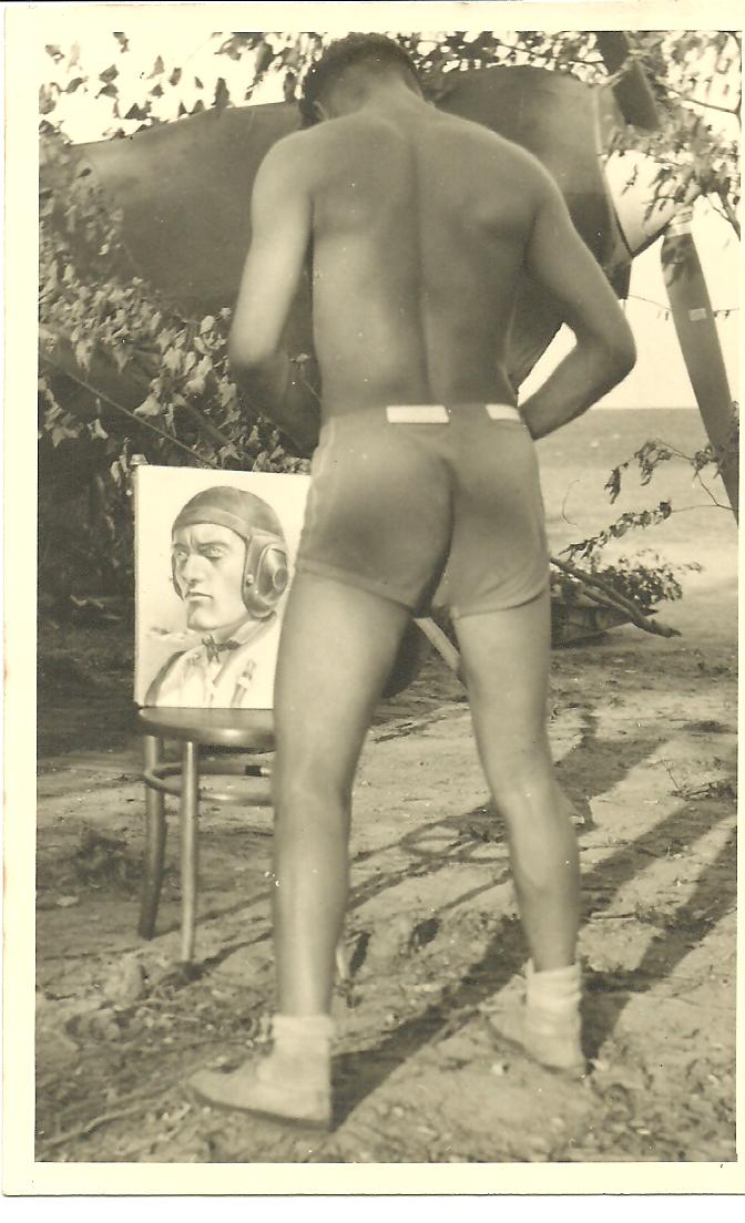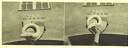 Auf der Rückseite der Fotos steht geschrieben: "Hoffentlich ist bald Feierabend, besser noch vor dem Frühstück" bzw. "frei schwebend mit Pinsel in linker Hand".