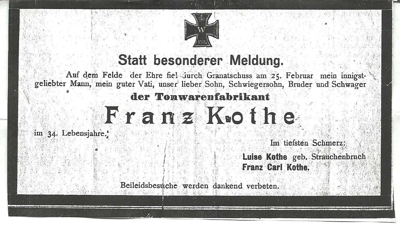 Der deutsche Kunstmaler, Bildhauer und Grafiker Franz Karl Kothe wurde am 11. 03. 1913 in Coswig/Anhalt als Sohn des Tonwarenfabrikanten Franz Kothe (1882-1916) und der Fleischerstochter Henriette Luise Kothe, geb. Strauchenbruch (1890-1974) geboren. Franz Kothes Vorfahren stammen aus Straach, einem Dorf unweit von Coswig/Anhalt.